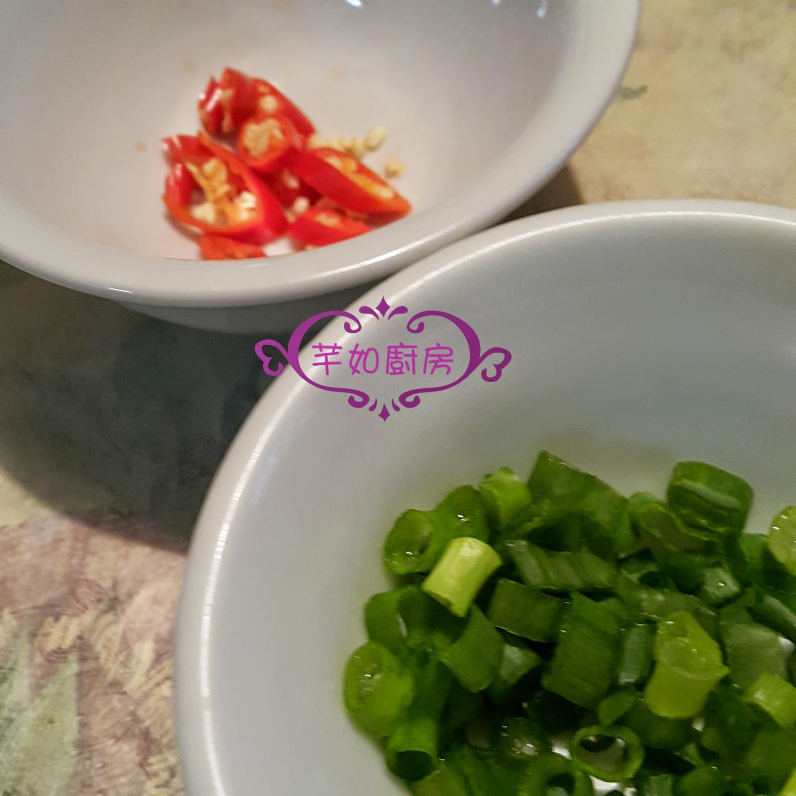 3 指天椒及青葱切成粒狀, 蒜頭切成蓉, 備用